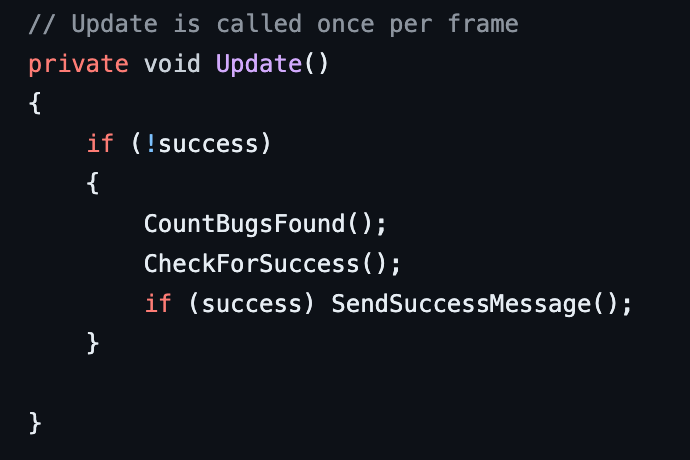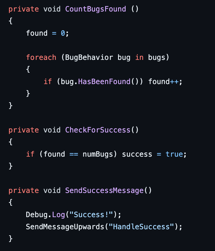 Image #2: Meanwhile, over in the ScoreCalculator, we are checking every frame to determine whether or not all of this level's bugs have been found. If they have, we'll call a different function to alert the LevelController to the player's success!