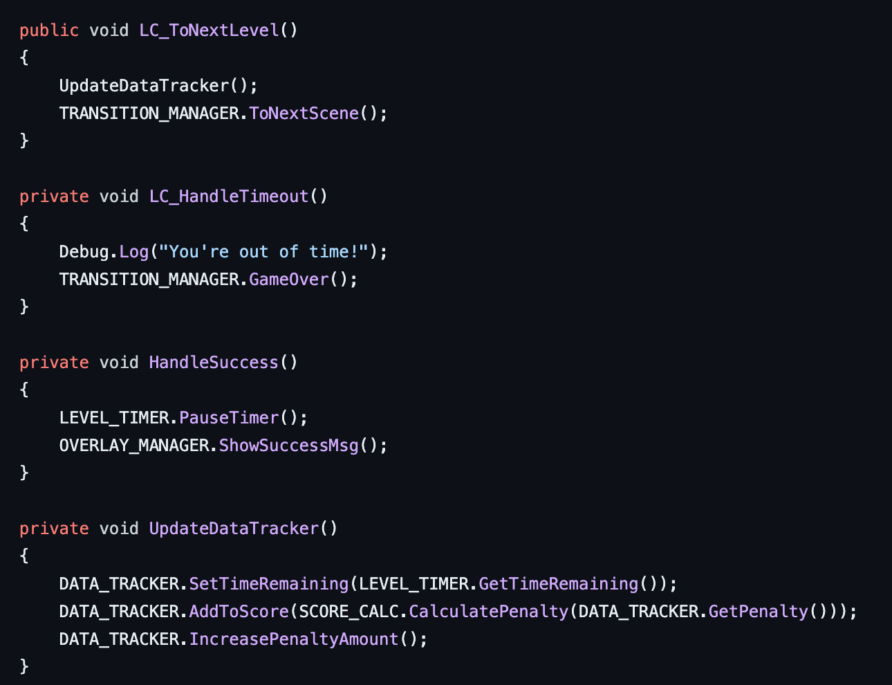 Image #3: As we can see here, the "SendSuccessMessage" function alerts any class that needs to respond immediately to the player's success -- like the LevelController.