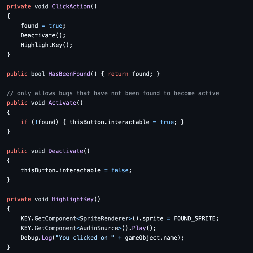 Image #6: It turns out that the OverlayManager has a number of functions that allow it to talk to the LevelController, thus allowing it to serve as the messenger between the player and the controller (since the player's actions primarily involve either clicking on Bugs, which have their own behaviors, or interacting with various elements for which the OverlayManager is responsible). Once the button on the "success" message is clicked, the OverlayManager will use the “RequestNextLevel” function tell the LevelController that it's time to move on, which will allow the program to do everything it needs to in order to prepare the next level, such as loading in the next scene, initializing the next set of bugs, and starting up the timer again.